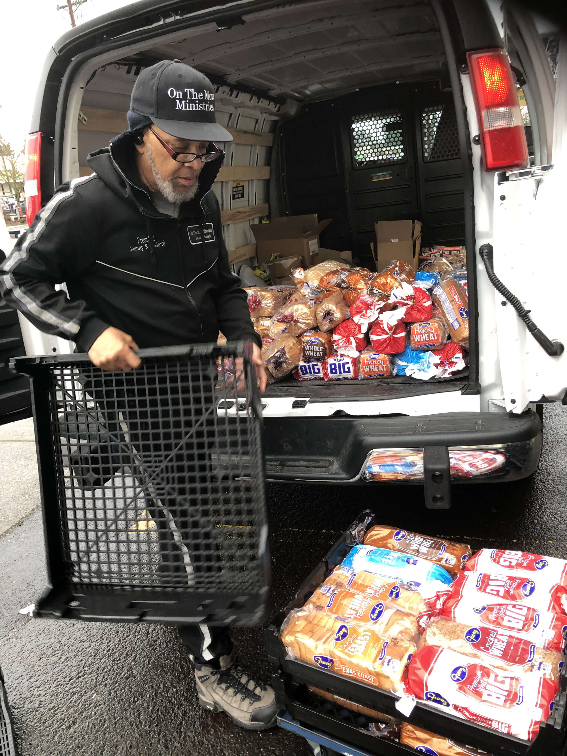 Elder Bradford distributes bread and food weekly to various transition project places throughout the greater Portland area, and under the Morrison and Burnside Bridge.
